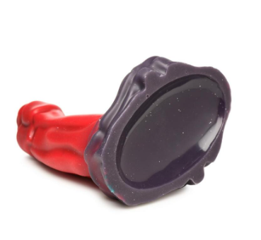 This massive red rod has a black base silver glitter throughout the shaft that makes it looks like flecks of metal or formica. The head has a knob on it and then widens out. The shaft has large, firm yet flexible ridges. At the base is an extra horn that can tickle or tease your taint, perineum, balls, backdoor or clit. Made out of premium, flexible, phthalate-free silicone, this dong is body-safe and best used with water-based lubricants only. Enjoy hands-free rides due to the strong suction cup base! Invite a partner to indulge in kinky cosplay or fantasy roleplay and use their favorite harness to transform this dong into a strap-on! Afterward, make sure to wash it with warm water and mild soap, then spray it with a toy cleaner and air-dry. Keep out of direct sunlight and heat.