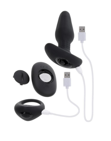 A powerful duo of vibrating remote-control toys designed for multiple possibilities. Supple and smooth, the plug tapers to a rounded, textured tip and finishes with rumbling, rotating beads at the neck before widening to a safety base handle. The ABS ring is chunky on top and narrows at the bottom curve for maximum comfort. Each 10-speed shape is independently controlled for a custom experience.
