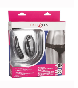Indulge in your newest dirty little secret with the Remote Control Panty Set. This sexy set includes a stretch-to-fit cheeky panty, curved panty teaser and a discreet remote control with a range of up to 32’ (10 m). Whenever or wherever passion takes you, this passionate mini vibrator’s 12 intense functions of vibration are ready for playtime. The sexy and stretchy lace panties feature a discreet internal pocket for the perfect stimulator pocket. Machine washable and oh-so comfortable, these vibrating panties are made for extended wear and adventurous playtime.Whether you choose to stay in control or you have left pleasure in your partner’s hand, this powerful teaser is sure to deliver knee-shaking sensation. From blushing beginners to erotic experts, this playful set adds versatile vibrations to any toy box. Recharge your passion in only 1 hour with the provided USB cable for up to 45 minutes of low-speed vibration or 40 minutes of high-intensity stimulation.